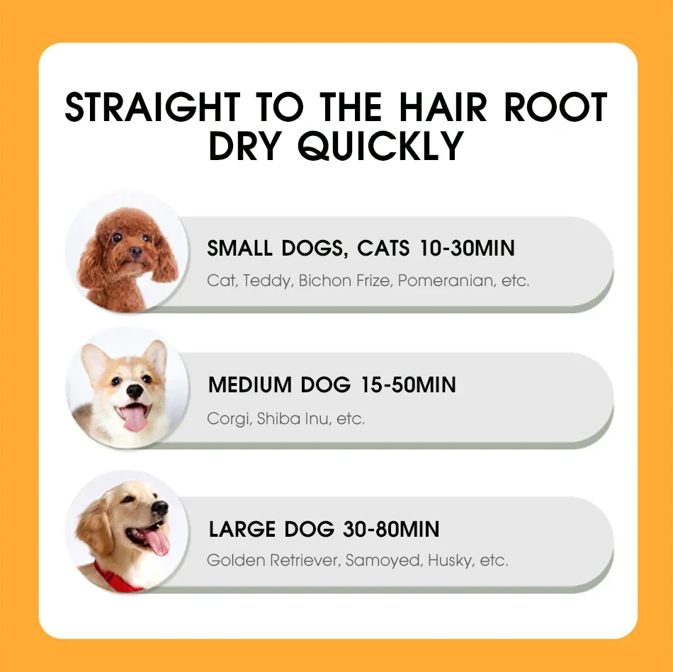 【Suitable for Your Pet】The power cord is 2meters long, safe and eco-friendly, with amaximum power of about 300W. It is gentle and does not hurt the skin, allowing your pet to easily enjoy the drying service.